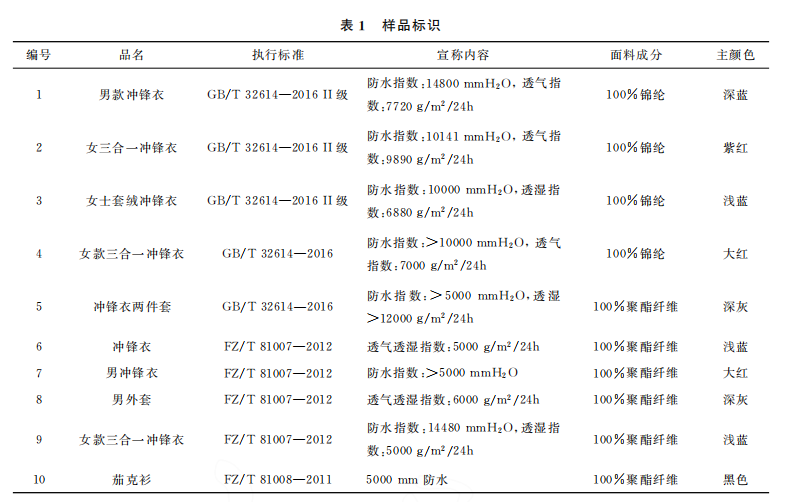 分別從實(shí)體店和網(wǎng)絡(luò)平臺(tái)購(gòu)買中端品牌的沖 鋒衣,不同品牌10件,價(jià)格區(qū)間在1000元左右。 其中 執(zhí) 行 標(biāo) 準(zhǔn) 標(biāo) 示 了 GB/T32614—2016 的 5 件,未標(biāo)示 GB/T32614—2016而宣稱有防水性 能和/或透濕性能的5件,詳見表1。
