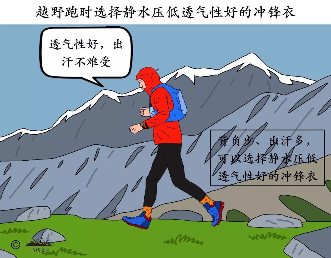 既然沖鋒衣的透氣性與防水性成反比,在一些排汗要求高、雨雪威脅小的戶外活動,比如越野跑,你就需要傾向于高透氣性的沖鋒衣。
