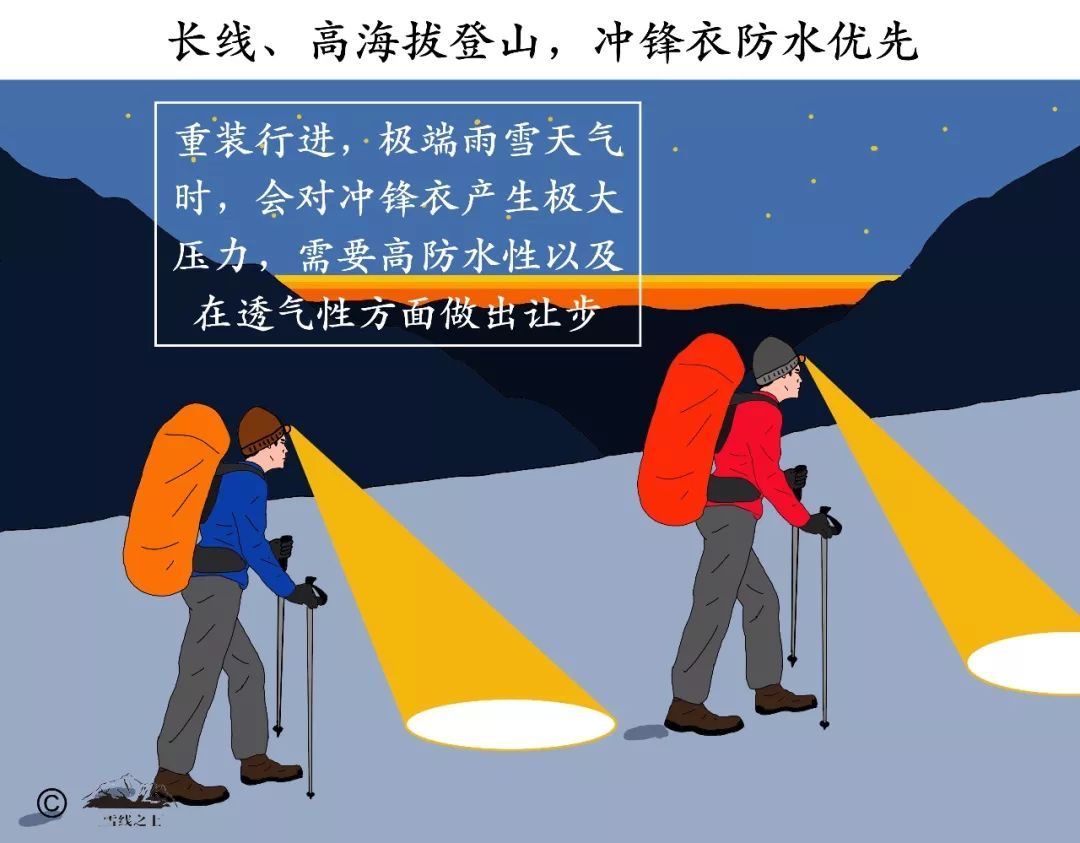 長線重裝徒步、高海拔登山——這種活動需要背負重裝包,極端雨雪天氣沖鋒衣有因背包壓力浸透的可能,從而帶來失溫風險。所以,此類活動需要沖鋒衣具備高防水性,而在透氣性方面做出讓步,比如GORE-TEX Pro系列產品。