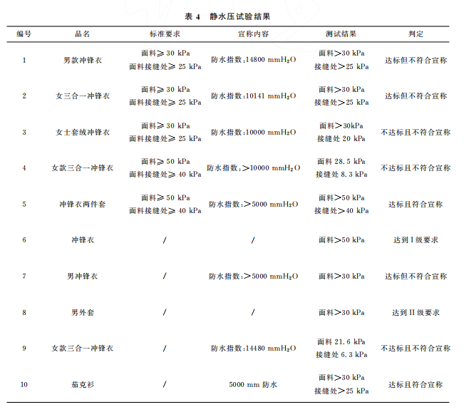 本文最終的判定是結(jié)合 GB/T32614—2016《戶外運(yùn)動(dòng)服裝 沖鋒衣》中面料功能性要求和產(chǎn)品銷售時(shí)的吊牌宣稱進(jìn)行。達(dá)標(biāo)是指符合沖鋒衣的合格品 標(biāo) 準(zhǔn) 要 求,反 之 則 不 符 合。10 件 樣 品中,只有5件達(dá)標(biāo),且只有3件是符合吊牌宣稱內(nèi)容。其中,標(biāo)示了 GB/T32614—2016的沖鋒衣,有3件達(dá)標(biāo),合格率為60%。近年來,監(jiān)管部門的抽查合格率一般在80%左右。這次比較試驗(yàn)合格率偏低的原因可能是樣品量較少,樣品的價(jià)格區(qū)間比較集中,且考核了接縫處的靜水壓。值得注意的是有2件沒有標(biāo)示 GB/T32614—2016的外套,其性能都符合標(biāo)準(zhǔn)要求。此外,銷售方對(duì)靜水壓的宣稱都偏高,有3件達(dá)標(biāo)了卻不符合自身的宣稱內(nèi)容。沖鋒衣 GB/T32614—2016標(biāo)準(zhǔn) 中 I級(jí) 對(duì) 靜 水 壓 的 要 求 也 只是:面料≥50kPa和面料接縫處≥50kPa,銷售 方卻往往宣稱100kPa,甚至達(dá)150kPa,而且也沒有充分考慮到面料接縫處靜水壓值會(huì)相對(duì)偏小的現(xiàn)實(shí)。需要警 醒 的 是,5 件 標(biāo) 示 了 GB/T32614—2016的沖鋒衣其綜合宣傳都不符合規(guī)定,存在執(zhí)行標(biāo)準(zhǔn)標(biāo)注正確卻夸大宣傳的嫌疑。