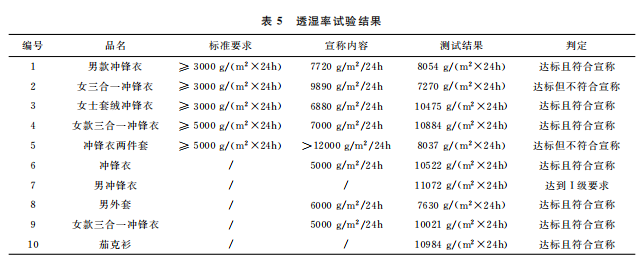 表面抗?jié)裥?、靜水壓和透濕率綜合統(tǒng)計(jì)的測試結(jié)果見表6。