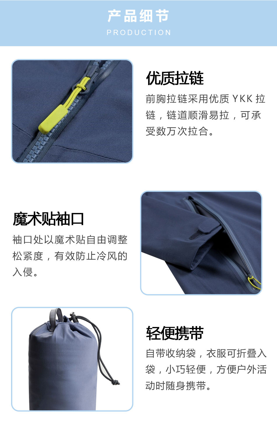 優質拉鏈:前胸拉鏈采用優質YKK拉鏈,鏈道順滑易拉,可承受數萬次拉合。