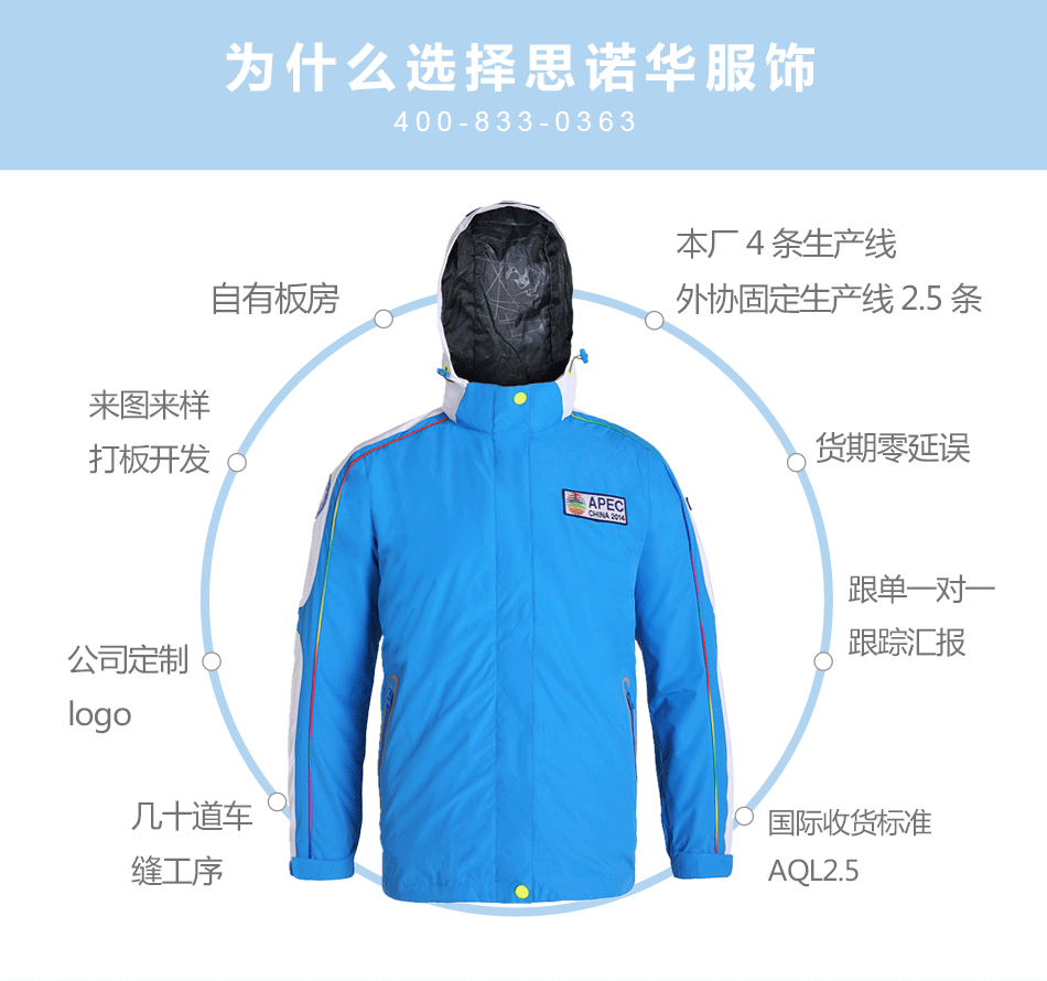 可脫卸沖鋒衣:可脫卸沖鋒衣定制,自由選配羽絨服&搖粒絨,保暖防風,輕便攜帶。