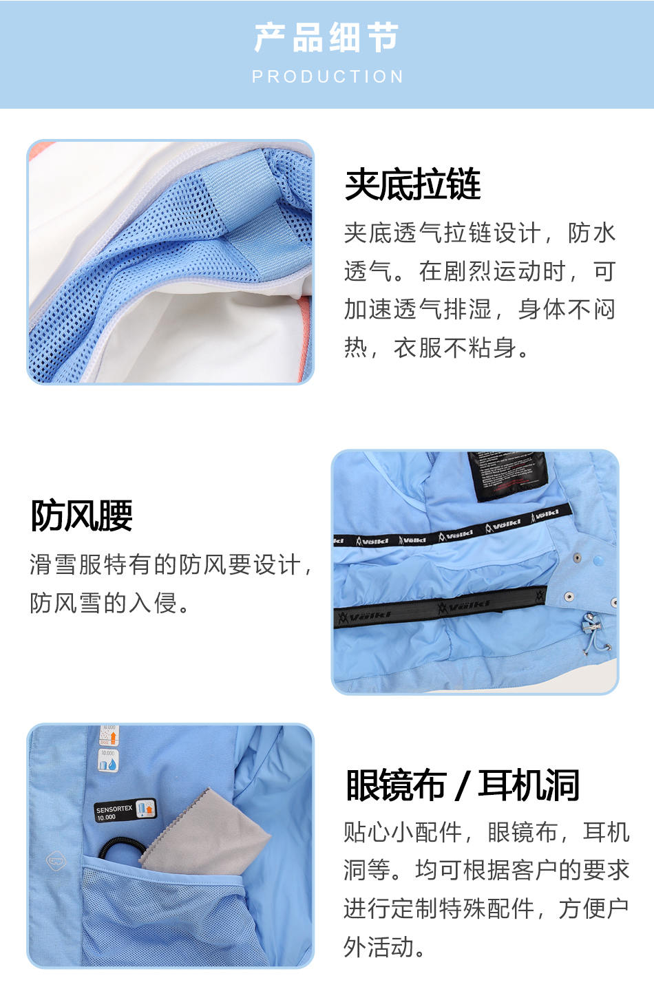 防水拉鏈采用無縫壓膠防水拉鏈激光熱封工藝貼合,面料采用進口防水透氣涂層膜,使防水透氣膜與面料完美結合??筛鶕蛻粜枨笸瓿?a href="http://m.sdyxs.cn/design/" target="_self">戶外沖鋒衣定制。