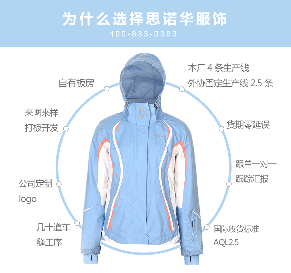 防水拉鏈采用無縫壓膠防水拉鏈激光熱封工藝貼合,面料采用進口防水透氣涂層膜,使防水透氣膜與面料完美結合??筛鶕蛻粜枨笸瓿?/span>戶外沖鋒衣定制。
