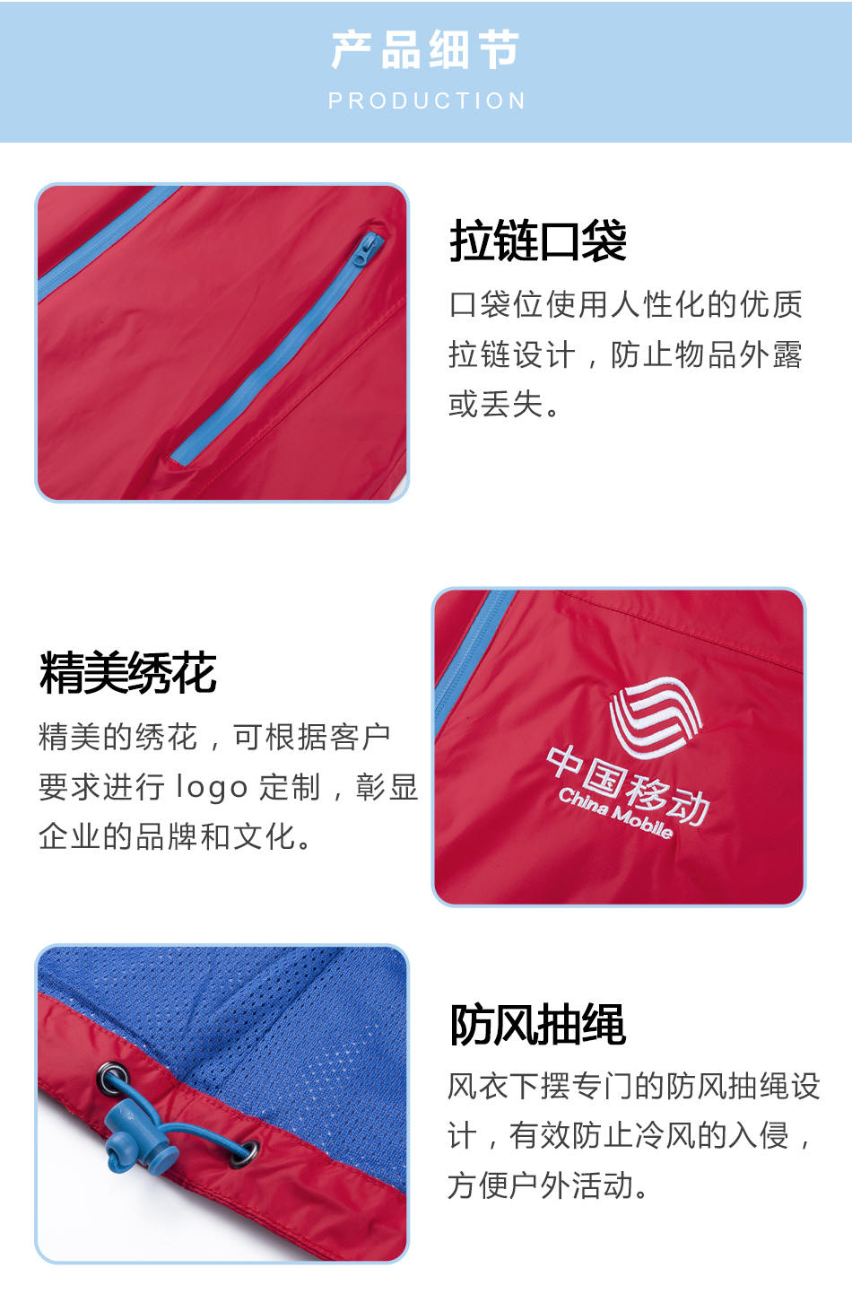 精美繡花:精美的繡花,可根據客戶要求單層風衣定制的logo設計,彰顯企業的品牌和文化。