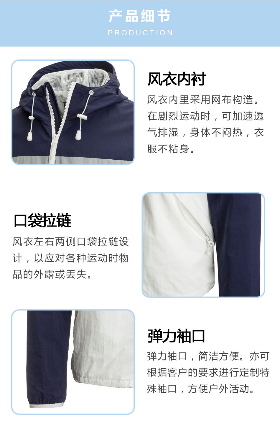 風衣內襯:風衣內里采用網布構造。在劇烈運動時,可加速透氣排濕,身體不悶熱,衣服不粘身,專業團體風衣定制。