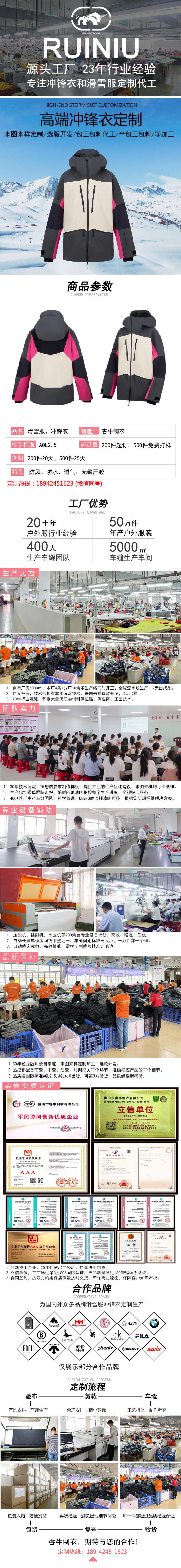 優質面料:專業高端滑雪服定制23年沉淀優質供應商資源,可根據客戶需求精選優質面料。