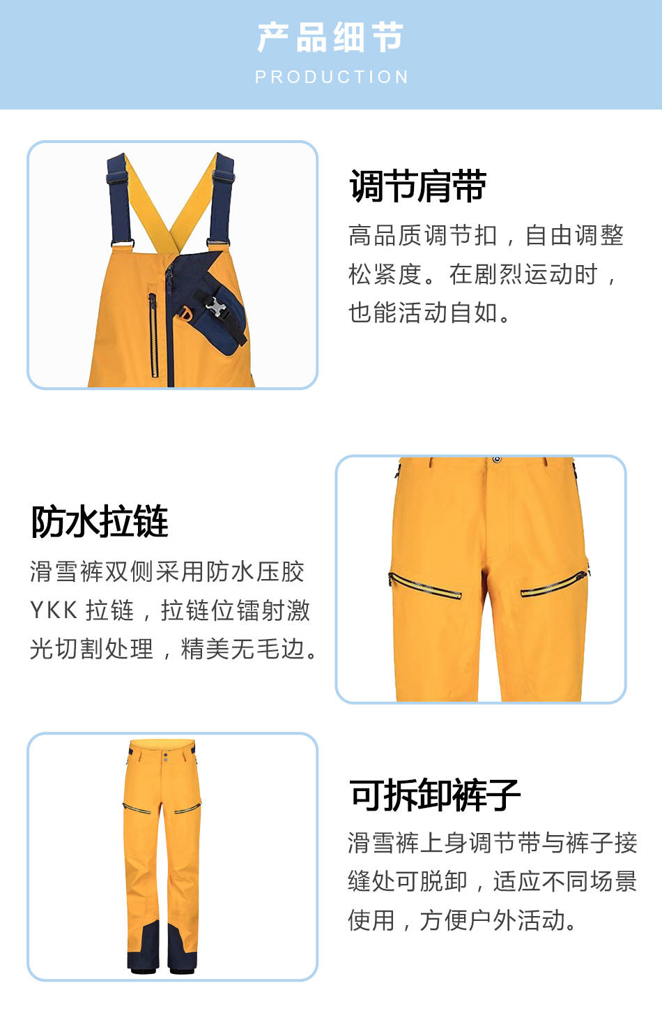 可拆卸褲子:滑雪褲上身調(diào)節(jié)帶與褲子接縫處可脫卸,適應不同場景使用,方便戶外活動。