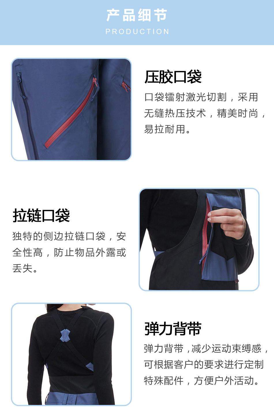 拉鏈口袋:戶外滑雪褲生產獨特的側邊拉鏈口袋,安全性高,防止物品外露或丟失。