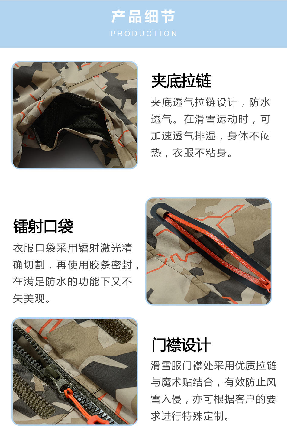 門襟設(shè)計:滑雪服門襟處采用優(yōu)質(zhì)拉鏈與魔術(shù)貼結(jié)合,有效防止風(fēng)雪入侵,亦可根據(jù)客戶的要求進行特殊定制。