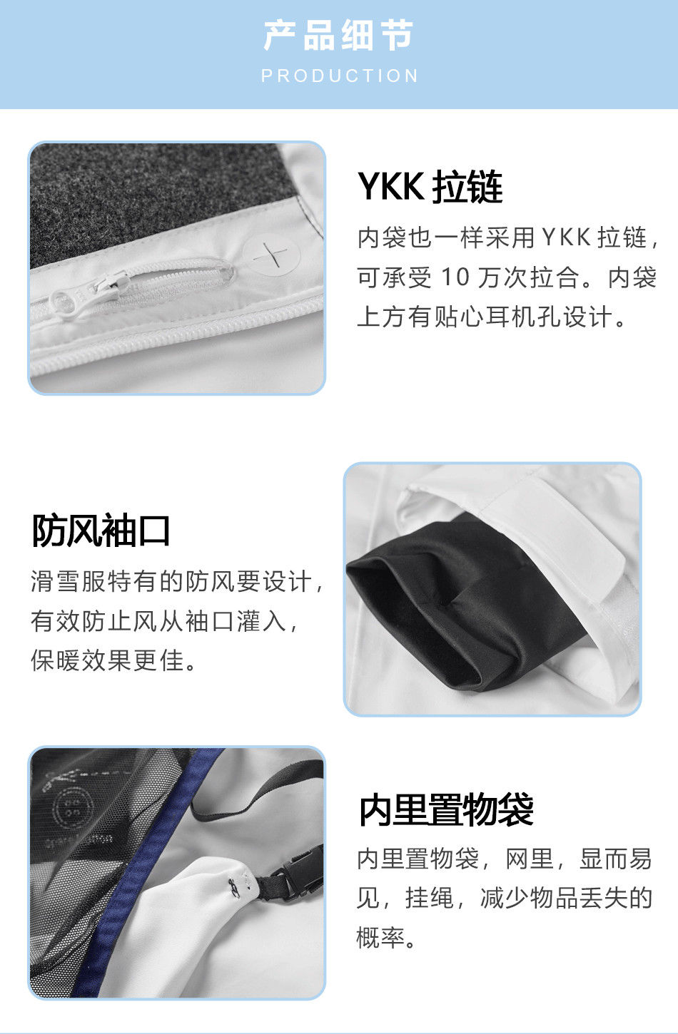 防風袖口:滑雪服特有的防風袖口設計,從袖口防止風進入身體,量身進行滑雪服定制。