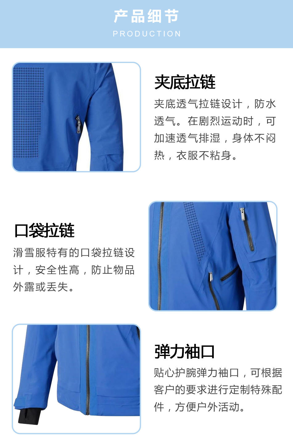 口袋拉鏈:滑雪服生產特有的口袋拉鏈設計,安全性高,防止物品外露或丟失。